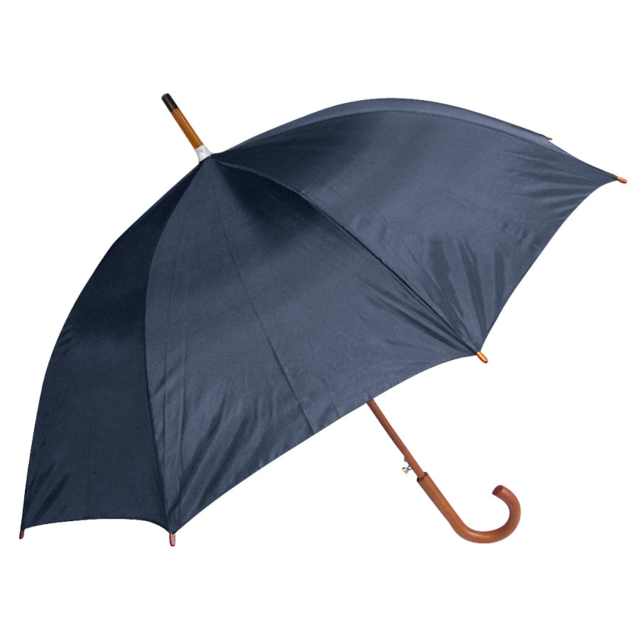Paraguas ejecutivo con cuerpo y mango curvo de madera barnizada. Varas reforzadas de fibra de vidrio, sistema de apertura automático, 8 cascos tela Nylon 190T.